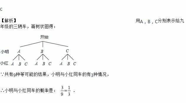 学校组织校外实践活动,安排给九年级三辆车,小明与小红都可以从这三辆车中任选一辆搭乘,小明与小红同车的概率是( )