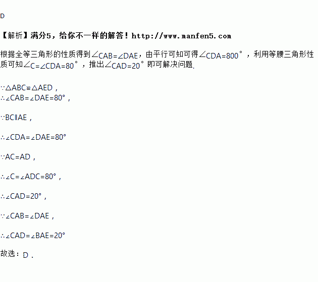 如图,△ABC≌△AED,点D在BC边上,BC∥AE,∠CAB=80°,则∠BAE的度数是( )