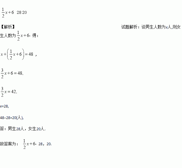 某班共有学生48人,已知女生比男生的一半多6人,若设男生为x人,则女生可表示为______ 人,可列方程,解得男生_______人,女生________人.