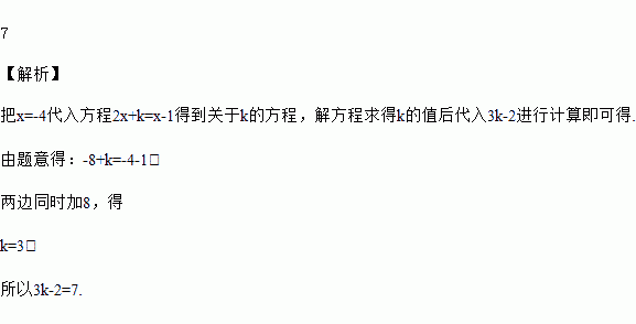 如果方程2x+k=x-1的解是x=-4,求3k-2的值.