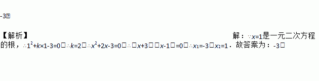 -3. 【解析】【解析】 ∵x=1是一元二次方程的根,∴12+k×1-3=0,∴k=2,∴x2+2x-3=0,∴(x+3)(x-1)=0,∴x1=-3,x2=1.故答案为:-3.