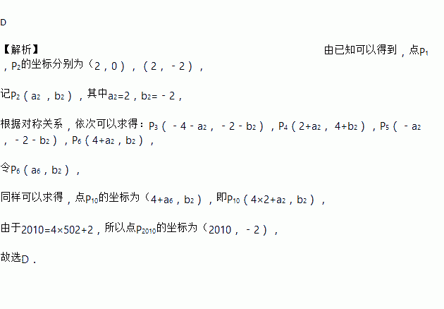 D 【解析】由已知可以得到,点P1,P2的坐标分别为(2,0),(2,﹣2), 记P2(a2 ,b2),其中a2=2,b2=﹣2, 根据对称关系,依次可以求得:P3(﹣4﹣a2,﹣2﹣b2),P4(2+a2, 4+b2),P5(﹣a2 ,﹣2﹣b2),P6(4+a2,b2), 令P6(a6,b2), 同样可以求得,点P10的坐标为(4+a6,b2),即P10(4×2+...