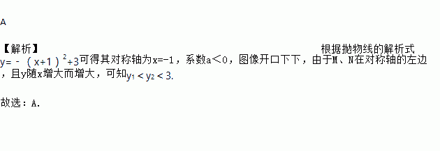点M(﹣3,y1),N(﹣2,y2)是抛物线 y=﹣(x+1)2+3上的两点,则下列大小关系正确的是( )