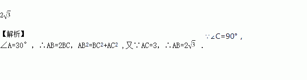 如图 ,在Rt△ABC中,∠C=90°,∠A=30°,AC=3,则斜边AB=______.