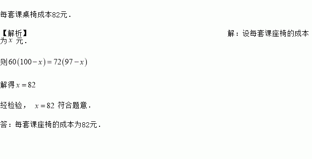 每套课桌椅成本82元. 【解析】【解析】 设每套课座椅的成本为元. 则 解得 经检验, 符合题意. 答:每套课座椅的成本为82元.