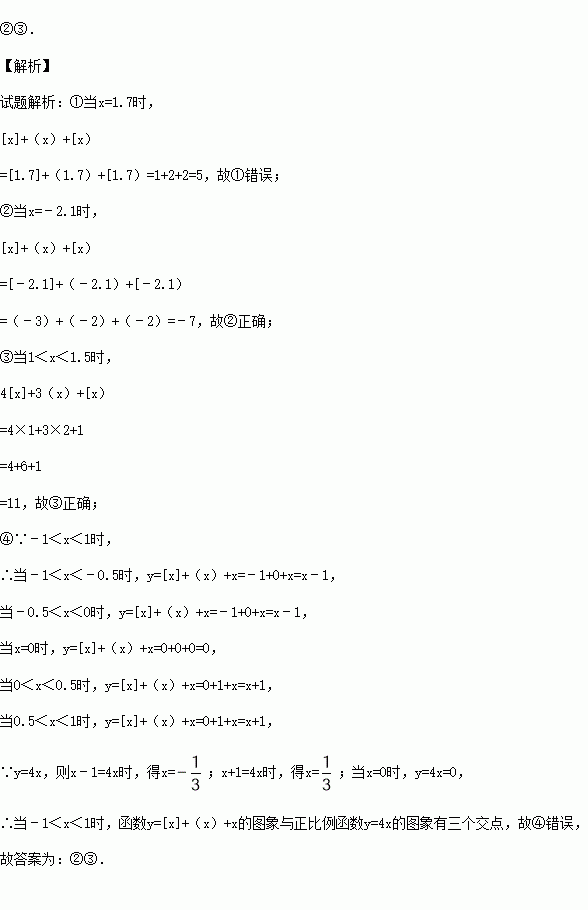 ④当﹣1<x<1时,函数y=[x]+(x)+x的图象与正比例函数y=4x的图象有两个交点.