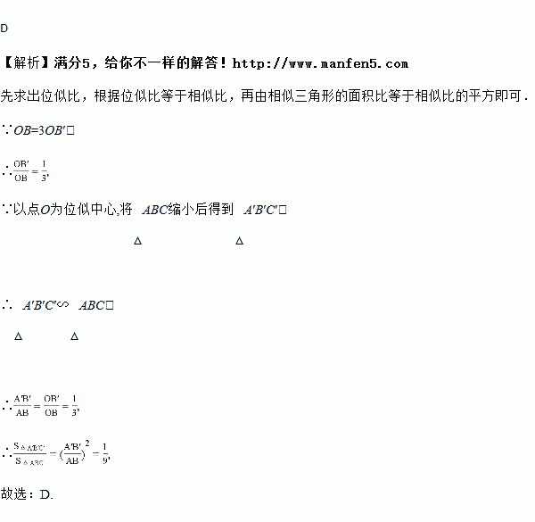 如图,以点O为位似中心,将△ABC缩小后得到△A′B′C′,已知OB=3OB′,则△A′B′C′与△ABC的面积比为( )