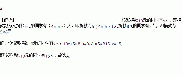山东省爱心公益群体为某白血病患者举行了募捐义演晚会,募捐近十万元. 若某中学某班45名学生为该患者捐款315元,且该班同学捐款情况如下表所示,则该班捐款10元的同学有( )