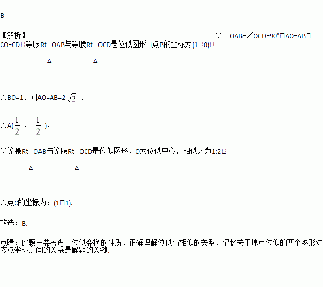 如图,△OAB与△OCD是以点O为位似中心的位似图形,相似比为1∶2,∠OCD=90°,CO=CD.若点B的坐标为(1,0),则点C的坐标为( )