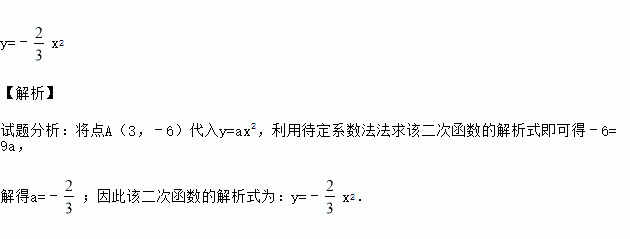 y=﹣x2 【解析】 试题分析:将点A(3,﹣6)代入y=ax2,利用待定系数法法求该二次函数的解析式即可得﹣6=9a, 解得a=﹣;因此该二次函数的解析式为:y=﹣x2.