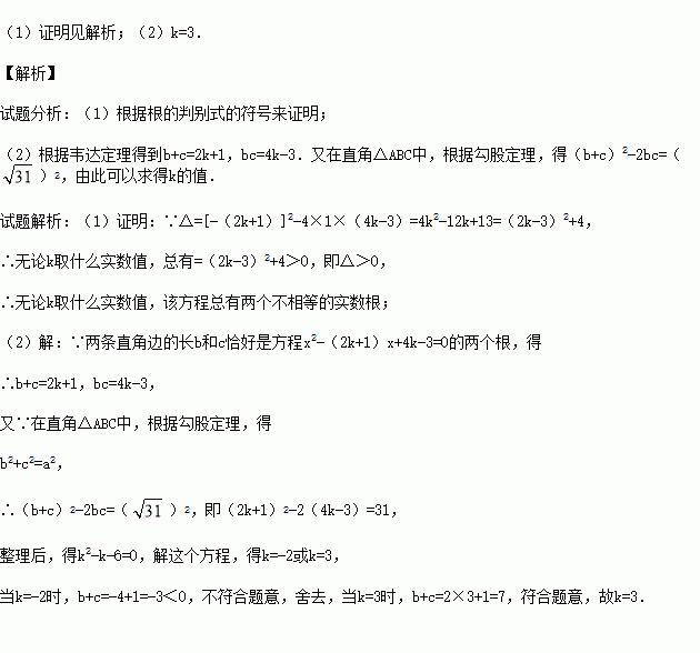 ,且两条直角边的长b和c恰好是这个方程的两个根时,求k的值.