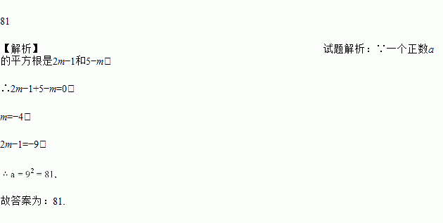 若一个正数a的平方根是2m-1和5-m,则a的值为_____________。