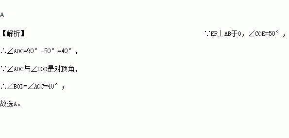 如图,直线AB、CD相交于点O,EF⊥AB于O,且∠COE =50°,则∠BOD等于( )