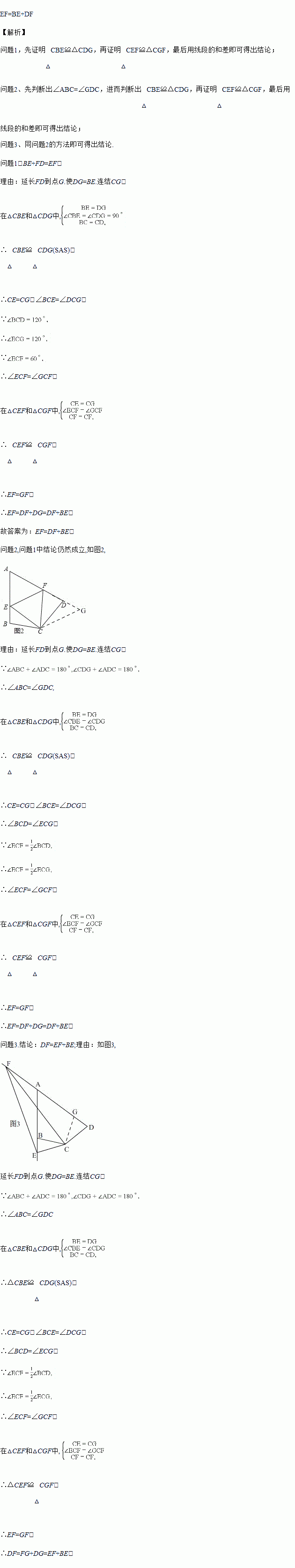 问题1:在四边形ABCD中,CB=CD,∠B=∠ADC=90°,∠BCD=120°.E,F分别是AB,AD上的点.且∠ECF=60°.探究图中线段BE,EF,FD之间的数量关系.