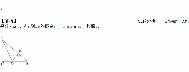如图,△ABC中,∠C=90°,AD平分∠BAC,交BC于D,若DC=7,则点D到AB的距离DE= .