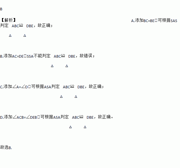 A. BC=BE B. AC=DE C. ∠A=∠D D. ∠ACB=∠DEB