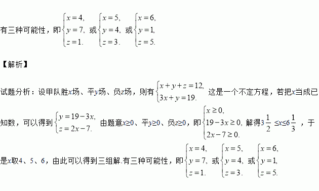 某足球协会举办了一次足球联赛,记分规则是:胜一场得3分,平一场得1分,负一场得0分.当比赛进行到12轮结束(每队均需比赛12场)时,甲队得分是19分,请你通过计算分析甲队胜几场、平几场、负几场?