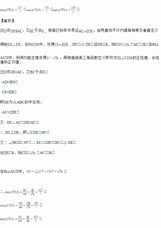 如图所示,△ABC中,D为AB的中点,DC⊥AC,且∠BCD=30°,求∠CDA的正弦值、余弦值和正切值.