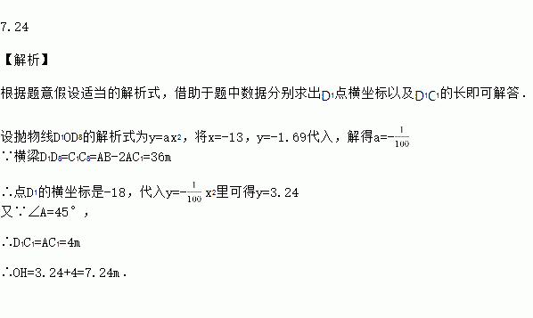 如图,一个拱形桥架可以近似看作是由等腰梯形ABD8D1和其上方的抛物线D1OD8组成.若建立如图所示的直角坐标系,跨度AB=44米,∠A=45°,AC1=4米,点D2的坐标为(-13,-1.69),则桥架的拱高OH=________米.