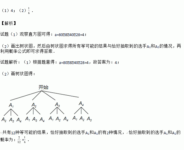 (2)将跳绳次数在160~190的选手依次记为A1、A2、…An,从中随机抽取两名选手作经验交流,请用树状或列表法求恰好抽取到的选手A1和A2的概率.