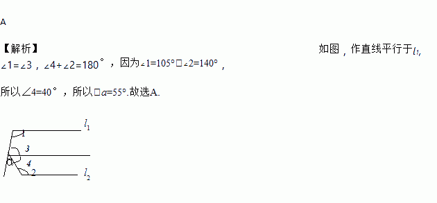 如图,l1//l2,∠1=105°,∠2=140°则∠a=( )