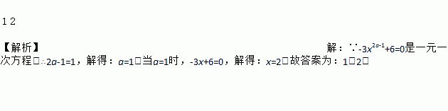 1 2 【解析】【解析】 ∵-3x2a-1+6=0是一元一次方程,∴2a-1=1,解得:a=1.当a=1时,-3x+6=0,解得:x=2.故答案为:1,2.