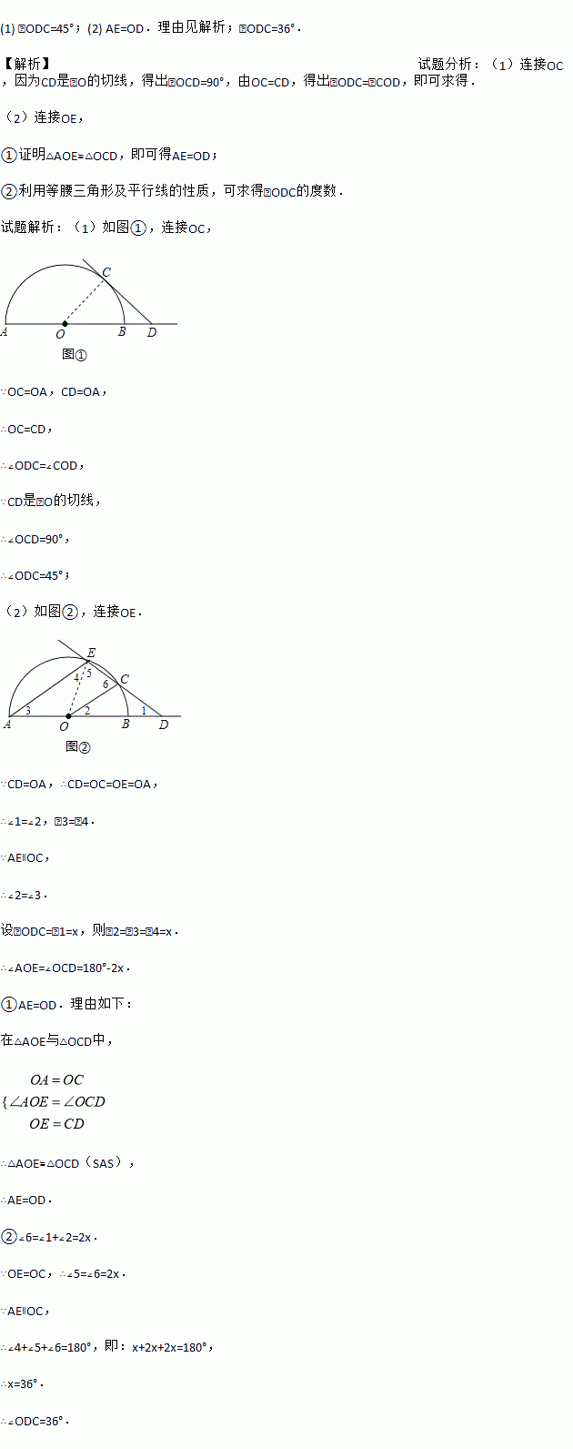 (1)当直线CD与半圆O相切时(如图①),求∠ODC的度数;