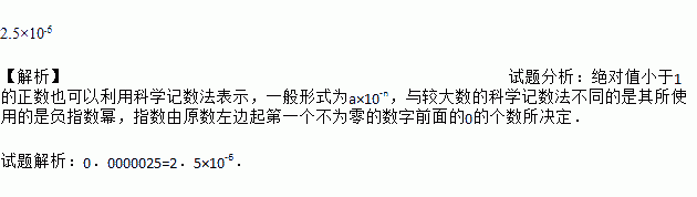 PM 2.5是指大气中直径小于或等于0.0000025m的颗粒物,将0.0000025用科学记数法表示为________.