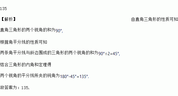 直角三角形两锐角的平分线所夹的钝角为_______度。
