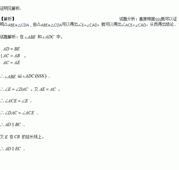 如图,在四边形中, ,延长线段到,使,连接、,且,求证: .