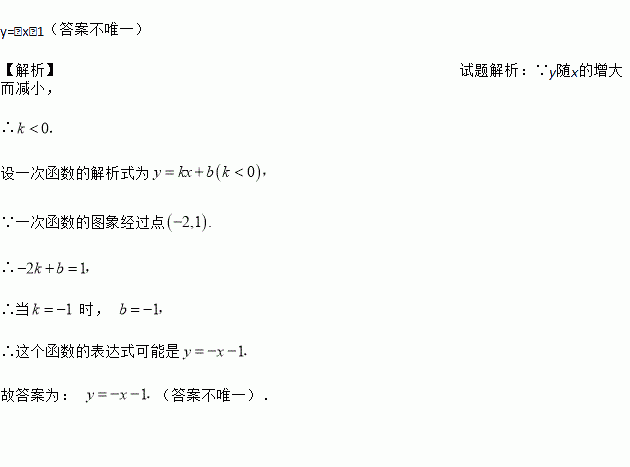 某一次函数的图象经过点(﹣2,1),且y轴随x的增大而减小,则这个函数的表达式可能是_____.(只写一个即可)