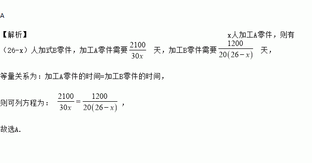 某机加工车间共有26名工人,现要加工2100个A零件,1200个B零件,已知每人每天加工A零件30个或B零件20个,问怎样分工才能确保同时完成两种零件的加工任务(每人只能加工一种零件)?设安排x人加工A零件,由题意列方程得( )