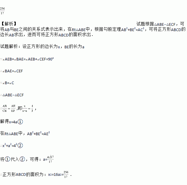 (题文)如图,在正方形ABCD中,点E,F分别在边BC,CD上,如果AE=4,EF=3,AF=5,那么正方形ABCD的面积等于________.