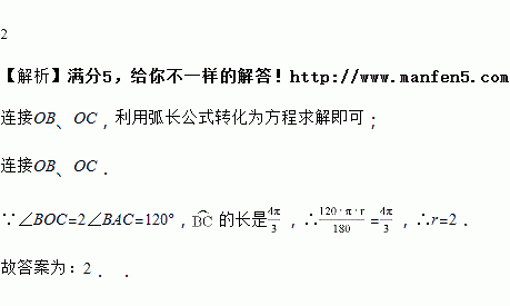 如图,△ABC是⊙O的内接三角形,∠BAC=60°,的长是,则⊙O的半径是________.