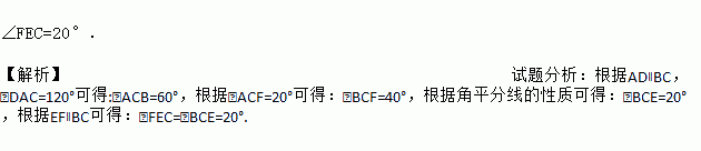 如图,EF∥AD,AD∥BC,CE平分∠BCF,∠DAC=120°,∠ACF=20°,求∠FEC的度数.