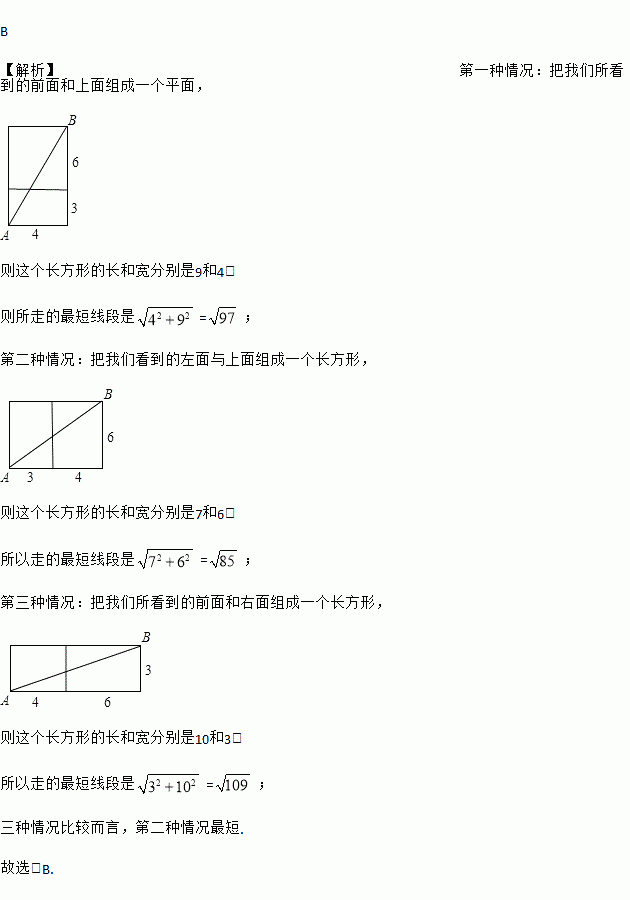 如图是一块长,宽,高分别是6cm,4cm和3cm的长方体纸盒子,一只老鼠要从长方体纸盒子的一个顶点A处,沿着长方体的表面到长方体上和A相对的顶点B处吃食物,那么它需要爬行的最短路径的长是( )