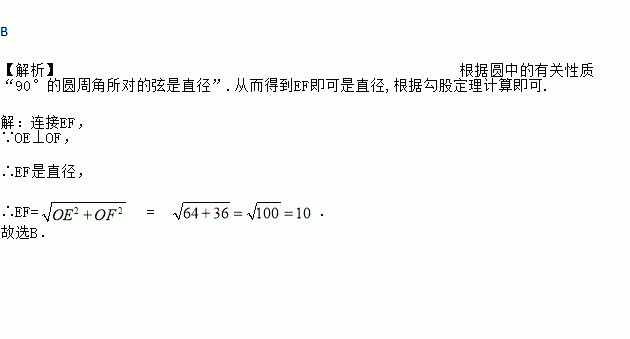 B 【解析】根据圆中的有关性质“90°的圆周角所对的弦是直径”.从而得到EF即可是直径,根据勾股定理计算即可. 【解析】 连接EF, ∵OE⊥OF, ∴EF是直径, ∴EF==. 故选B.
