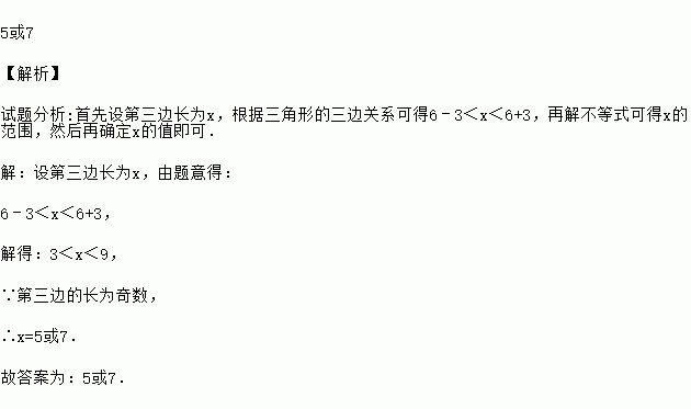 已知三角形两条边长分别为3和6,第三边的长为奇数,则第三边的长为 .