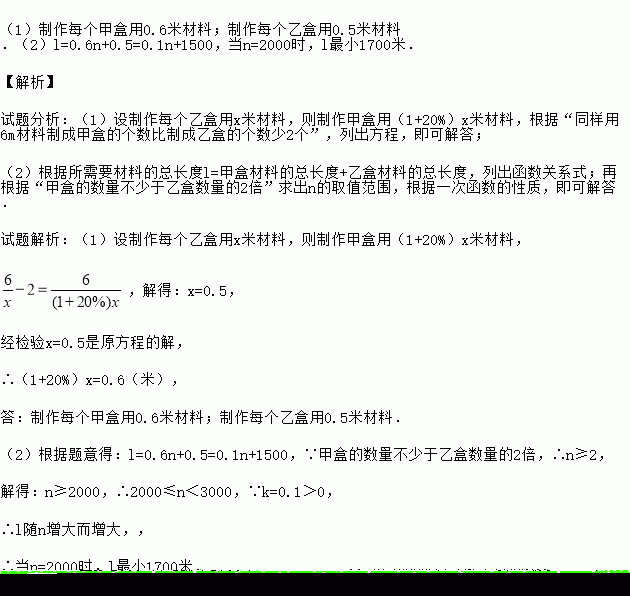 (2)如果制作甲、乙两种包装盒共3000个,且甲盒的数量不少于乙盒数量的2倍,那么请写出所需要材料的总长度l(m)与甲盒数量n(个)之间的函数关系式,并求出最少需要多少米材料?
