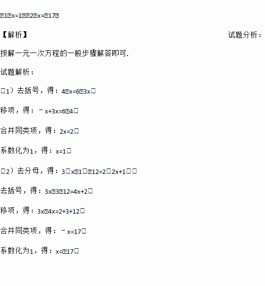 解方程:(1)4﹣x=3(2﹣x) (2)