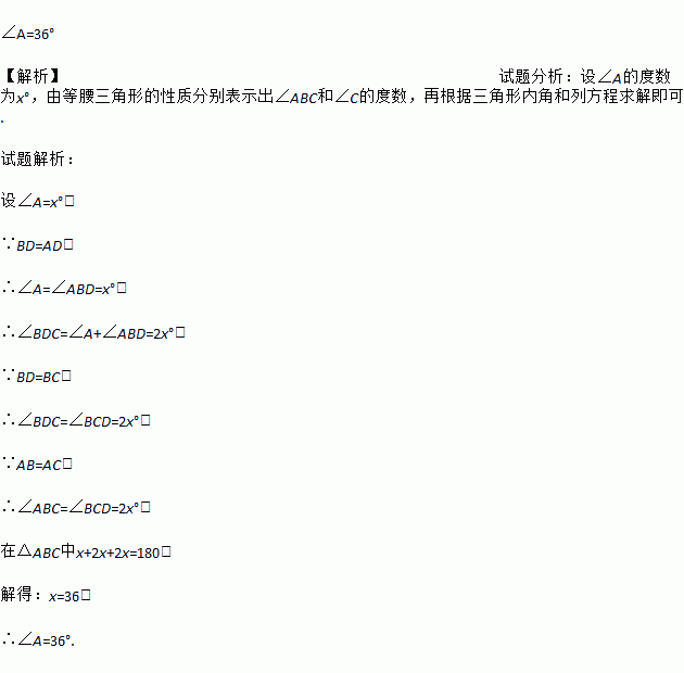 在△ABC中,AB=AC,BD是角平分线,BD=AD,求∠A的度数.