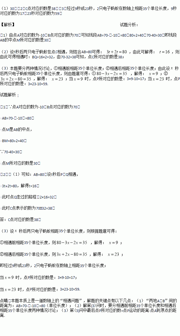 ⑶若当电子蚂蚁P从A点出发,以3个单位/秒的速度向右运动,同时另一只电子蚂蚁Q恰好从B点出发,以2单位/秒的速度向左运动,经过多长时间两只电子蚂蚁在数轴上相距35个单位长度,并写出此时P点对应的数.