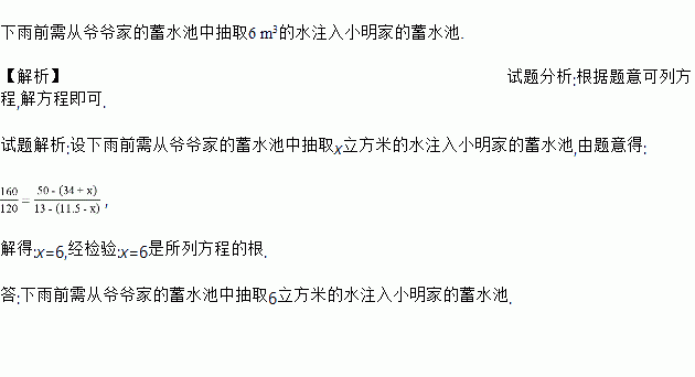 ÆøÏóÔ¤±¨¼´½«»áÏÂÓ꣬ΪÁËÊÕ¼¯¾¡¿ÉÄܶàµÄÓêË®£¬ÏÂÓêǰÐè´ÓÒ¯Ò¯¼ÒµÄÐîË®³ØÖгéÈ¡¶àÉÙÁ¢·½Ã×µÄ