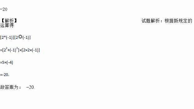 -20 【解析】试题解析:根据新规定的运算得 [2*(-1)][2◎(-1)] =[22+(-1)2]×[2×2×(-1)] =5×(-4) =-20. 故答案为: