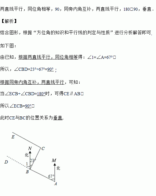 如图,某工程队从A点出发,沿北偏西67°方向修一条公路AD,在BD路段出现塌陷区,就改变方向,由B点沿北偏东23°的方向继续修建BC段,到达C点又改变方向,从C点继续修建CE段,若使所修路段CE∥AB,∠ECB应为多少度?试说明理由.此时CE与BC有怎样的位置关系?