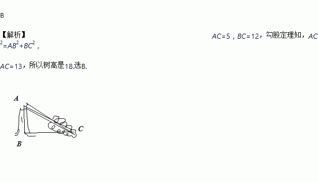 如图,一棵大树在一次强台风中于离地面5m处折断倒下,倒下后树顶落在树根部大约12m处。这棵大树折断前高度估计为 ( )