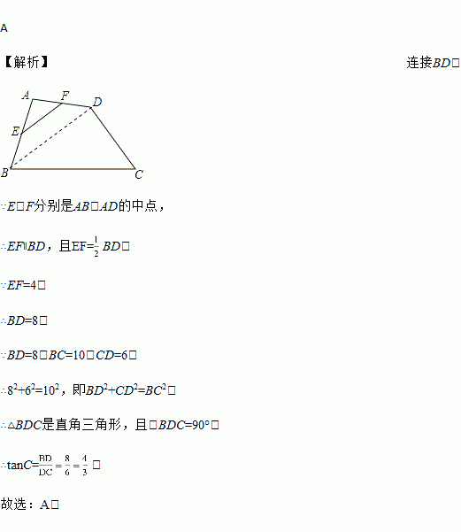 如图,在四边形ABCD中,E、F分别是AB、AD的中点,若EF=4,BC=10,CD=6,则tanC等于( )