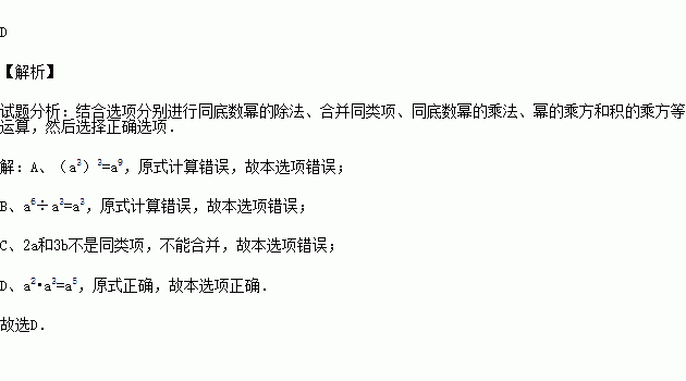 A.(a3)3=a6 B.a6÷a3=a2 C.2a+3b=5ab D.a2•a3=a5