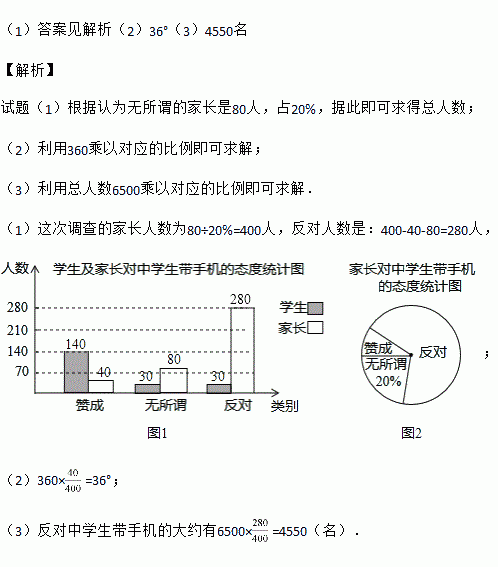 (3)已知某地区共6500名家长,估计其中反对中学生带手机的家长大约有多少名?
