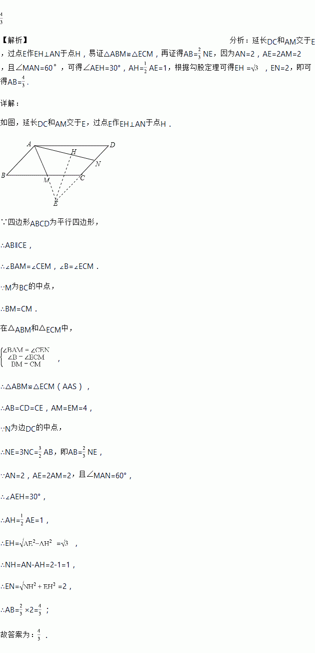 如图,在平行四边形ABCD中,M,N分别为BC,CD的中点,AM=1,AN=2,∠MAN=60°,AM ,DC的延长线相交于点E,则AB的长为_____________;